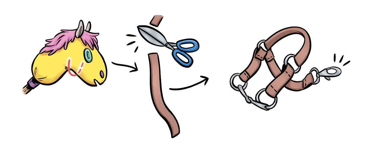 En lustfylld fakta- och pysselbok som lär barn att skapa egna käpphästar, tillbehör och stall. Fokus ligger på återbruk och kreativitet. Varvas med fotografier av Lotta Karlsson. Formgivning och sättning: Lisa Ernemar.